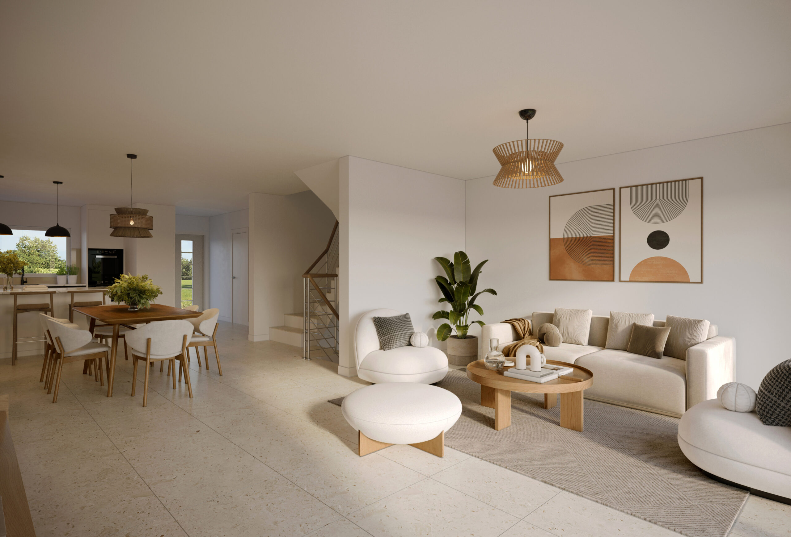Le rez-de-chaussée entièrement dédié aux espaces de vie propose une cuisine ouverte avec bar, un WC visiteur et un réduit de rangement. Il s’ouvre sur une terrasse et un jardin privatif.